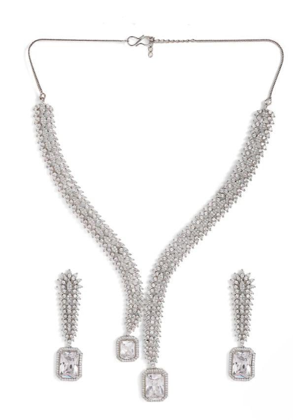 What You Get:- 1 N Rhodium Plated American Diamond Studded Silver Tone Necklaces With Matching 2 N Earrings